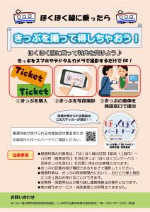 新潟県やほくほく線沿線自治体、北越急行株式会社で構成される「ほくほく線沿線地域振興連絡協議会」では、「きっぷを撮って得しちゃおう!」というキャンペーンを実施しています。