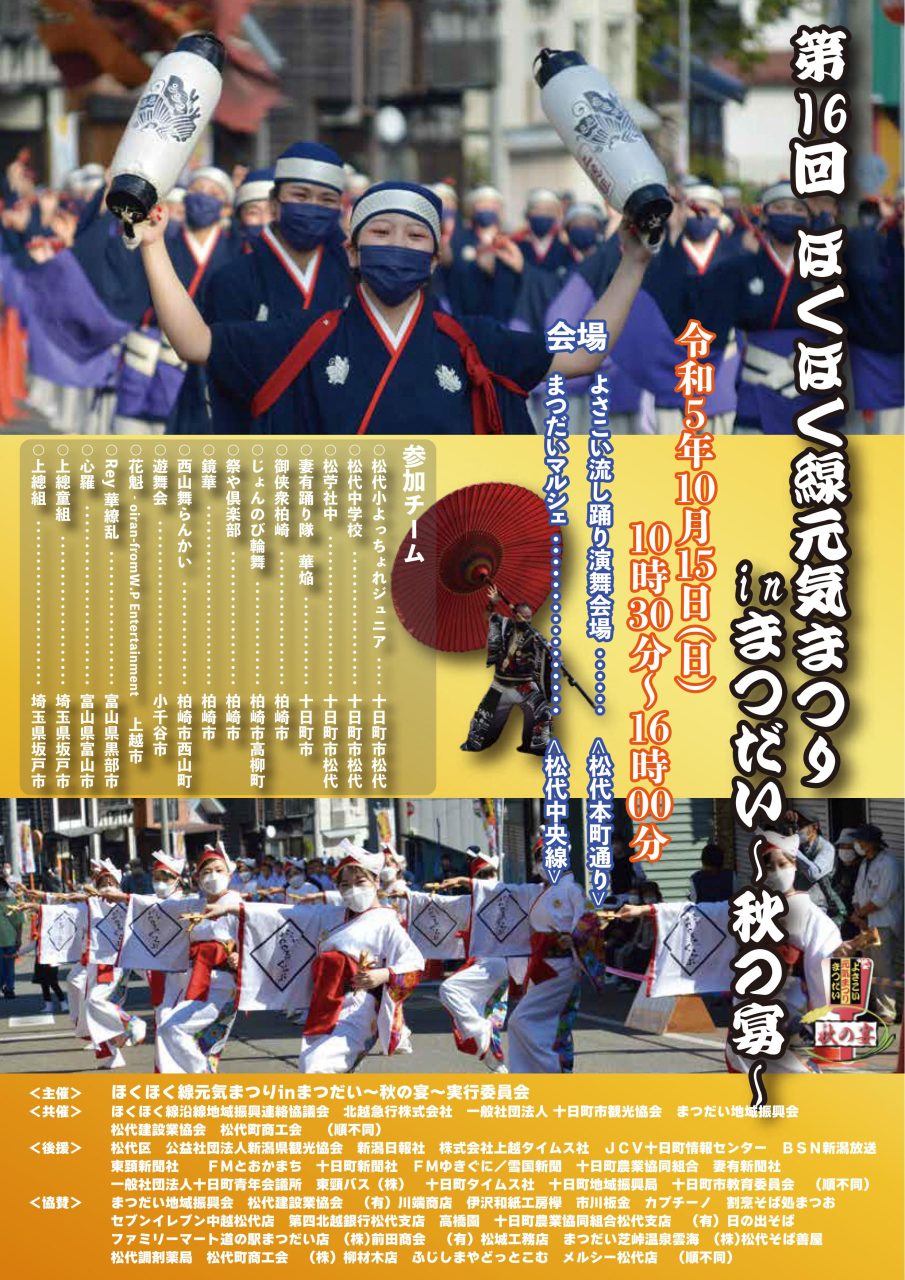 ●日時 令和5年10月15日(日)午前10時30分~午後4時 ●会場 よさこい流し踊り演舞会場…松代本町通り まつだいマルシェ…松代中央線 ●参加チーム ・松代...