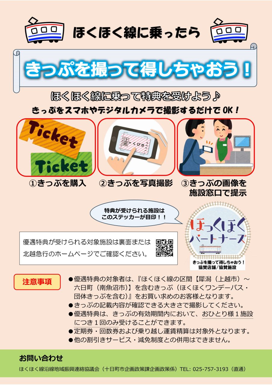 ●「きっぷを撮って得しちゃおう!」とは 新潟県やほくほく線沿線自治体、北越急行株式会社で構成される「ほくほく線沿線地域振興連絡協議会」では、「きっぷを撮って得し...