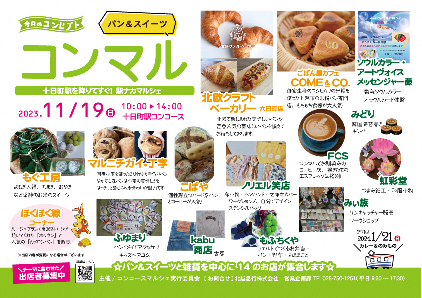 ●コンマルとは? ほくほく線をつなぐほくほく線をつなぐ駅マルシェ「コンマル」。 月ごとにコンセプトが変わり、沿線の地産品や手作り品が出品されます! ほくほく線を...