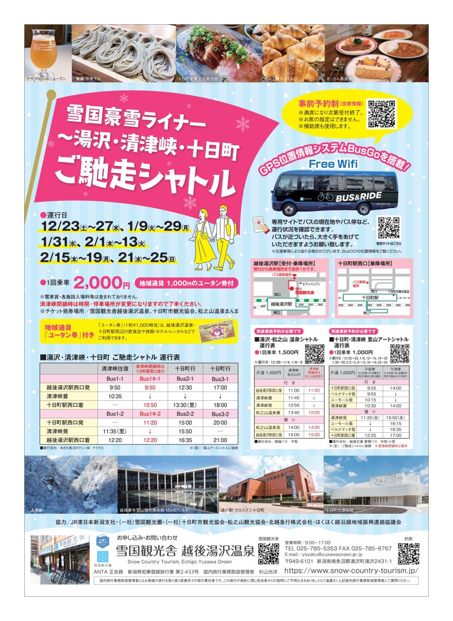 越後湯沢駅と十日町駅を拠点に、清津峡や松之山温泉をつなぐ、3つのバスを運行します。雪道の運転が不安な方も、安心してお越しいただけます。詳細は下記ホームページをご...