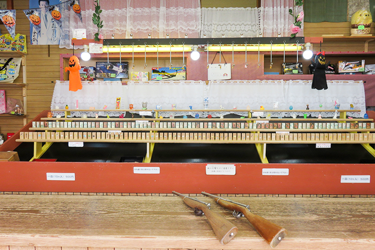 縁日やイベントでおなじみの射的が街なかに! 温泉街の娯楽として多い時は10軒ほどの射的屋さんがあったというが、現在は2軒のみ。小さい子どもからお年寄りまでカンタンに楽しく遊べるので、取りたい景品を狙ってチャレンジしてみよう!