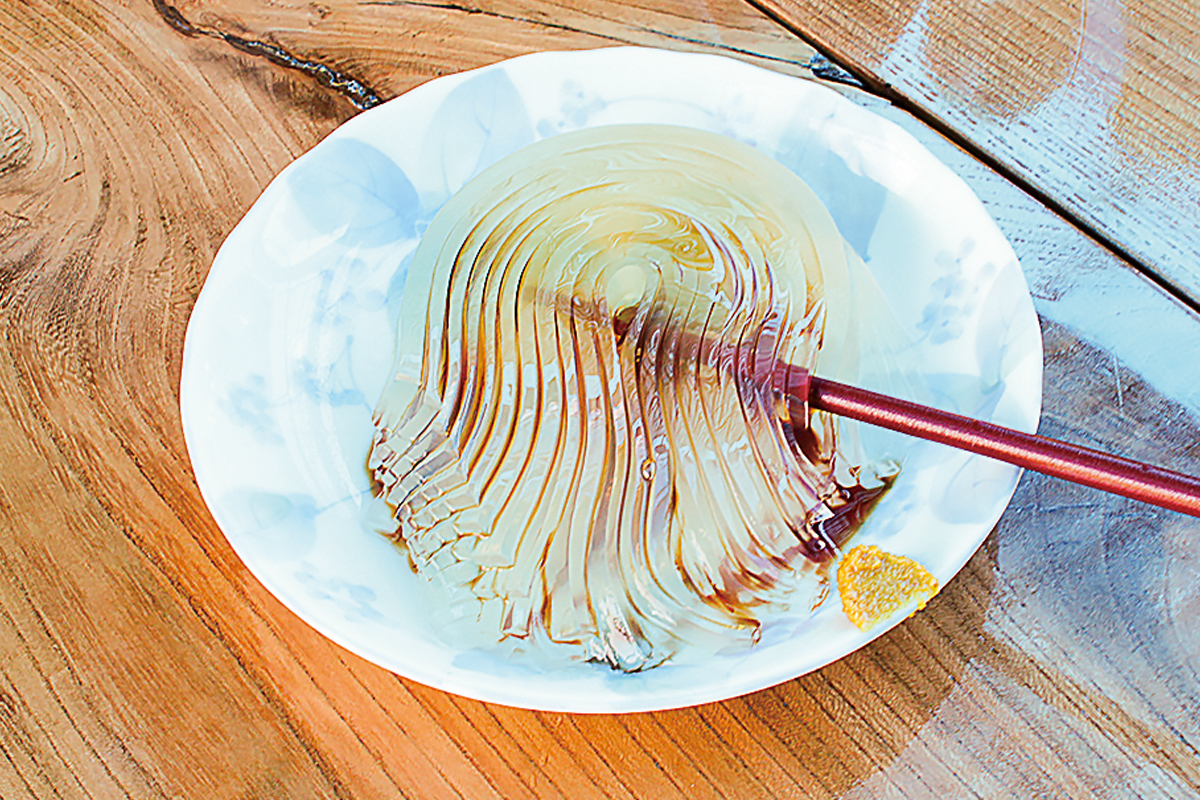 厳しい水質基準をクリアした冷たい湧き水と厳選した天草から作られる絶品のトコロテン1人前330円。現在5代目のご主人は、明治18年の創業以来の昔ながらの作り方で伝統の味を守っている。弘法大師が由来といわれる1本箸での食べ方も昔から変わらない。毎年日本全国からトコロテンと涼を求めてファンが訪れ、多い時は1日500食も出るのだとか。