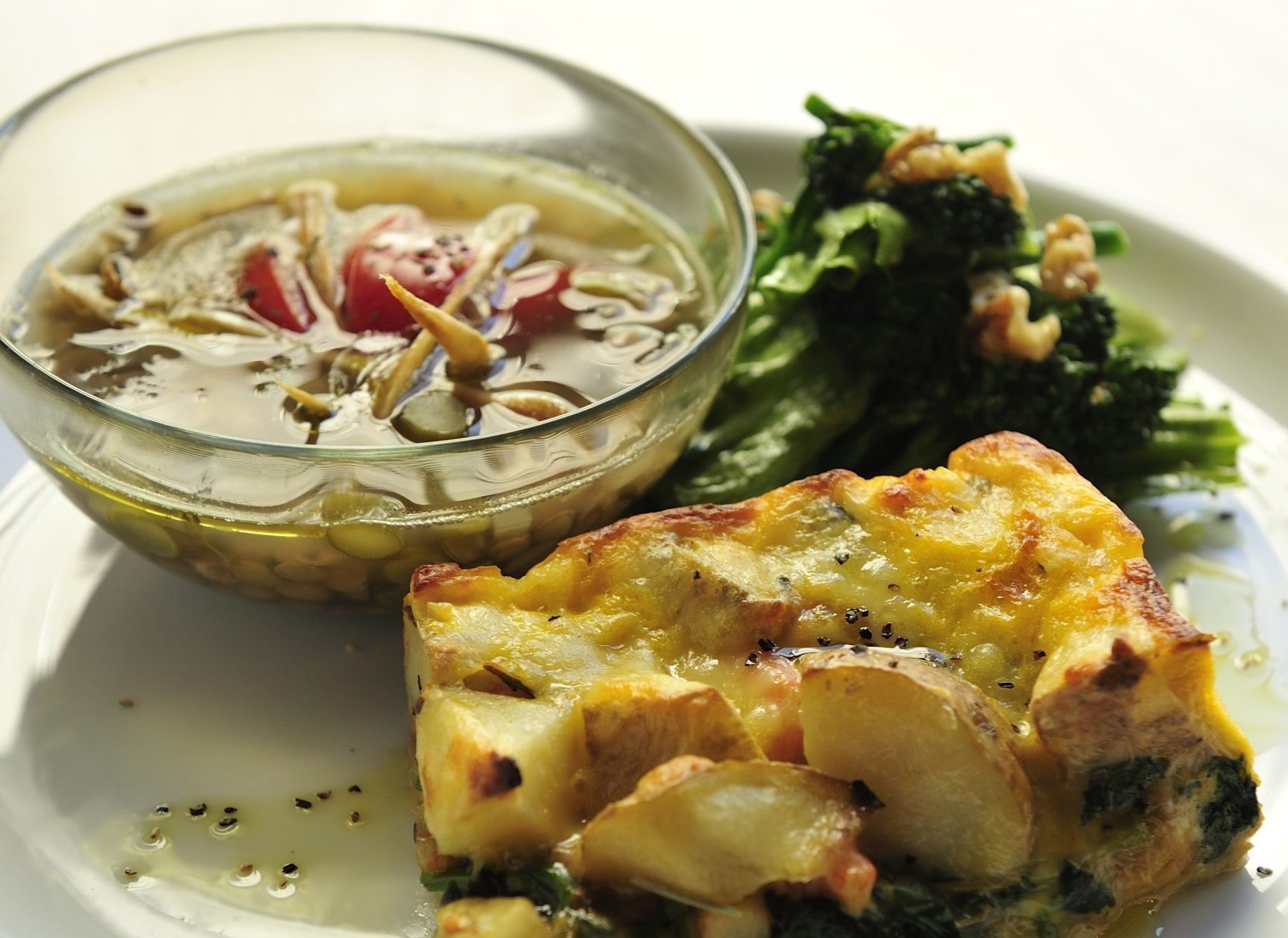 旬菜たっぷりのスープとローストポテト入り妻有豚チョリソーのキッシュ。