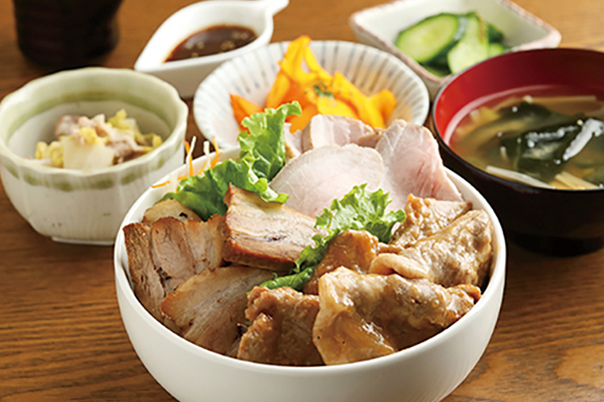 妻有ポークの肉まみれ丼 2,090円(税込)。香り高い甘みがある脂身と程よい歯ごたえに加え旨味がぎっしり詰まった赤身が特長の妻有ポーク。肩ロースの生姜焼き、もも肉のローストポーク、バラ肉のチャーシューがそれぞれ100gと妻有ポークを思う存分堪能できる人気のランチメニュー。