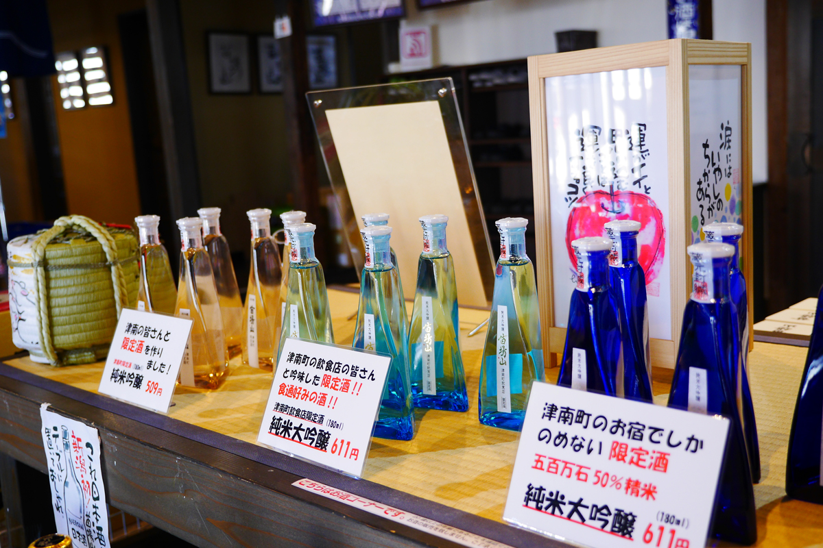 ドレス瓶が美しい津南限定酒3種。飲み終えたら一輪挿しにするのもいい。