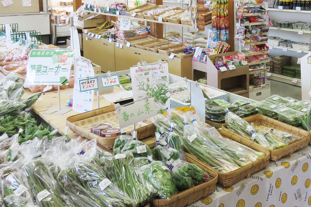 地元住民にこよなく愛される浦川原物産館にはメイドイン浦川原の野菜やお米、特産品などが所狭しと並ぶ。